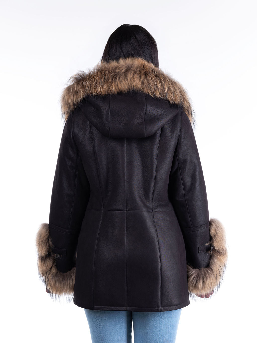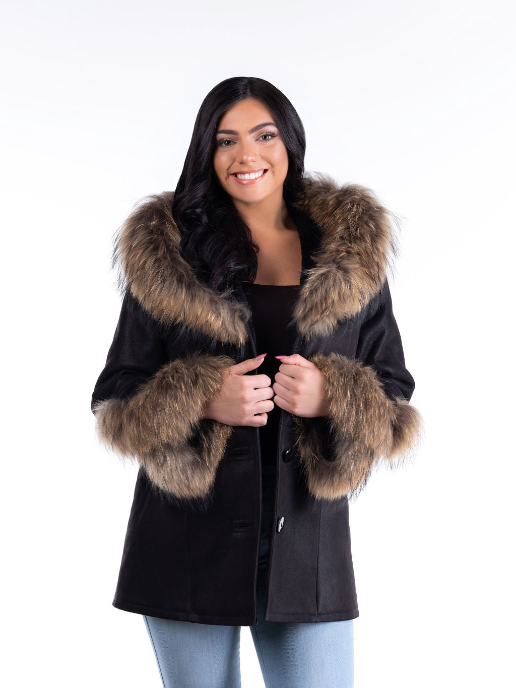 Our Renata shearling sheepskin coat lets you fight the cold in unparalleled style! Perfect for an elegant night out or to dress up your jeans. Button-front closure and gently fitted to accentuate your curves. Hood, shoulders, and cuffs are trimmed in fur for an extra style touch. Made in Poland. Available in sizes 36-54. See our size chart to find your perfect fit!