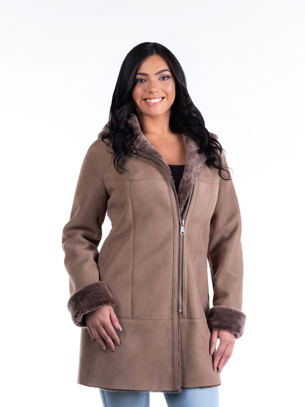 The Sara coat is perfect for everyday wear and a special evening out. Warm and soft, you'll turn heads in this simple yet elegant shearling sheepskin coat. Cuffs are adjustable. Zip-front closure. Made in Poland. Available in sizes 34-52. Use the size chart to find your perfect fit!