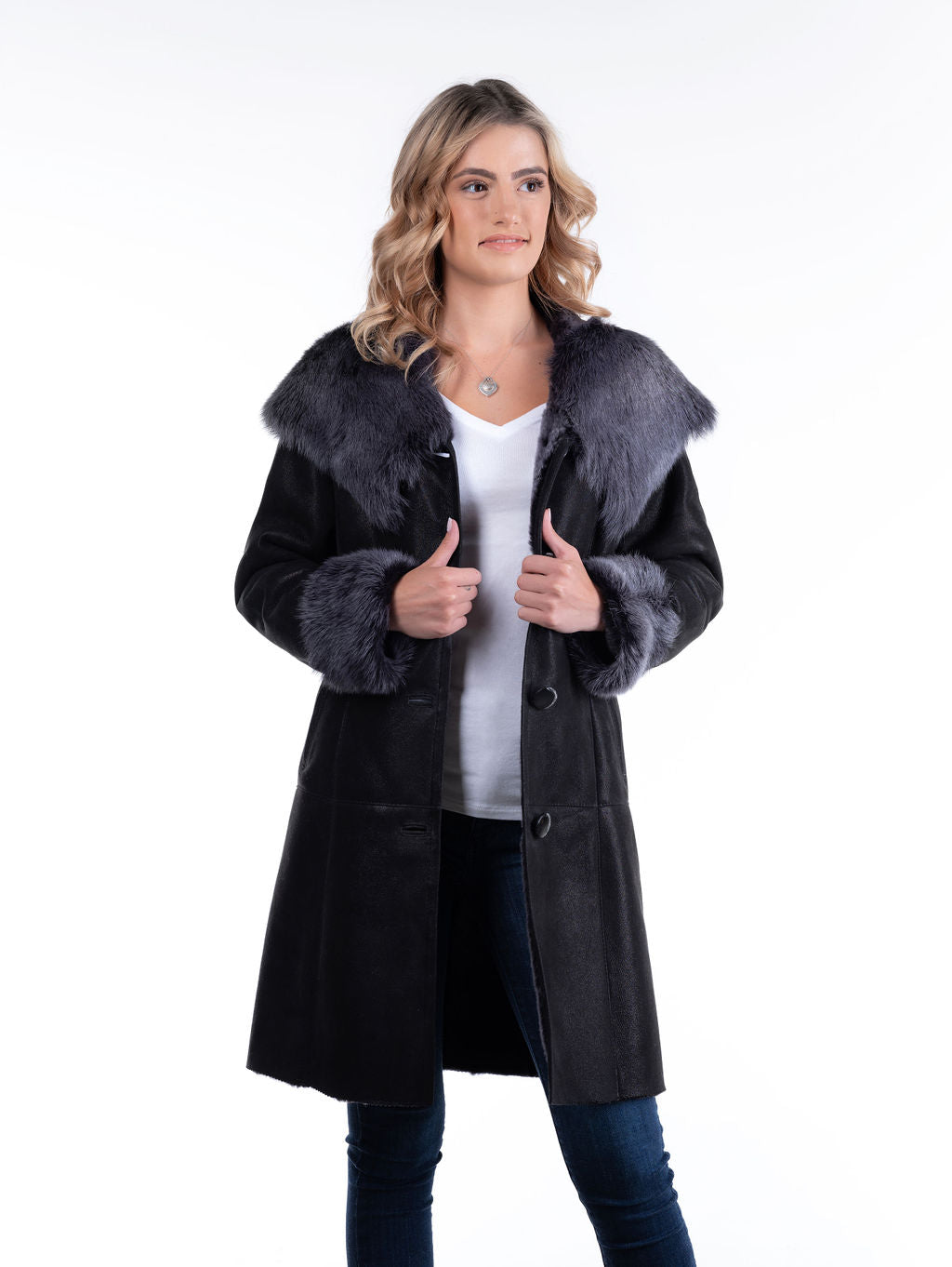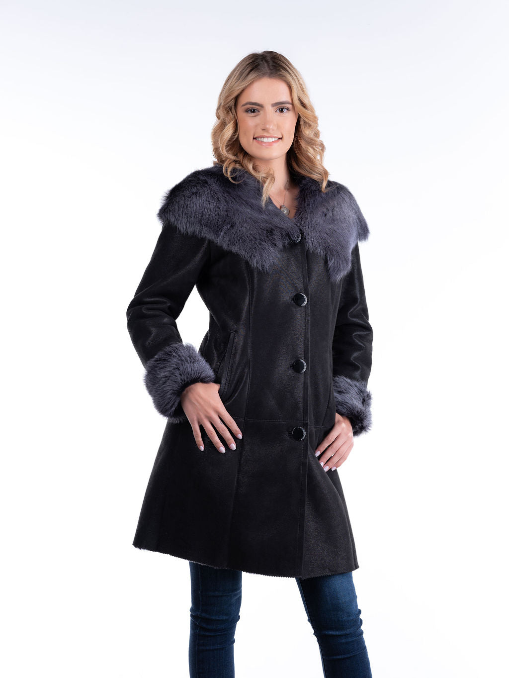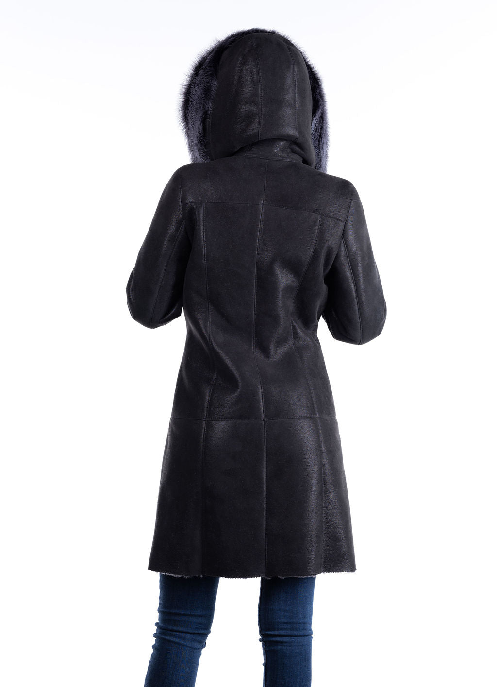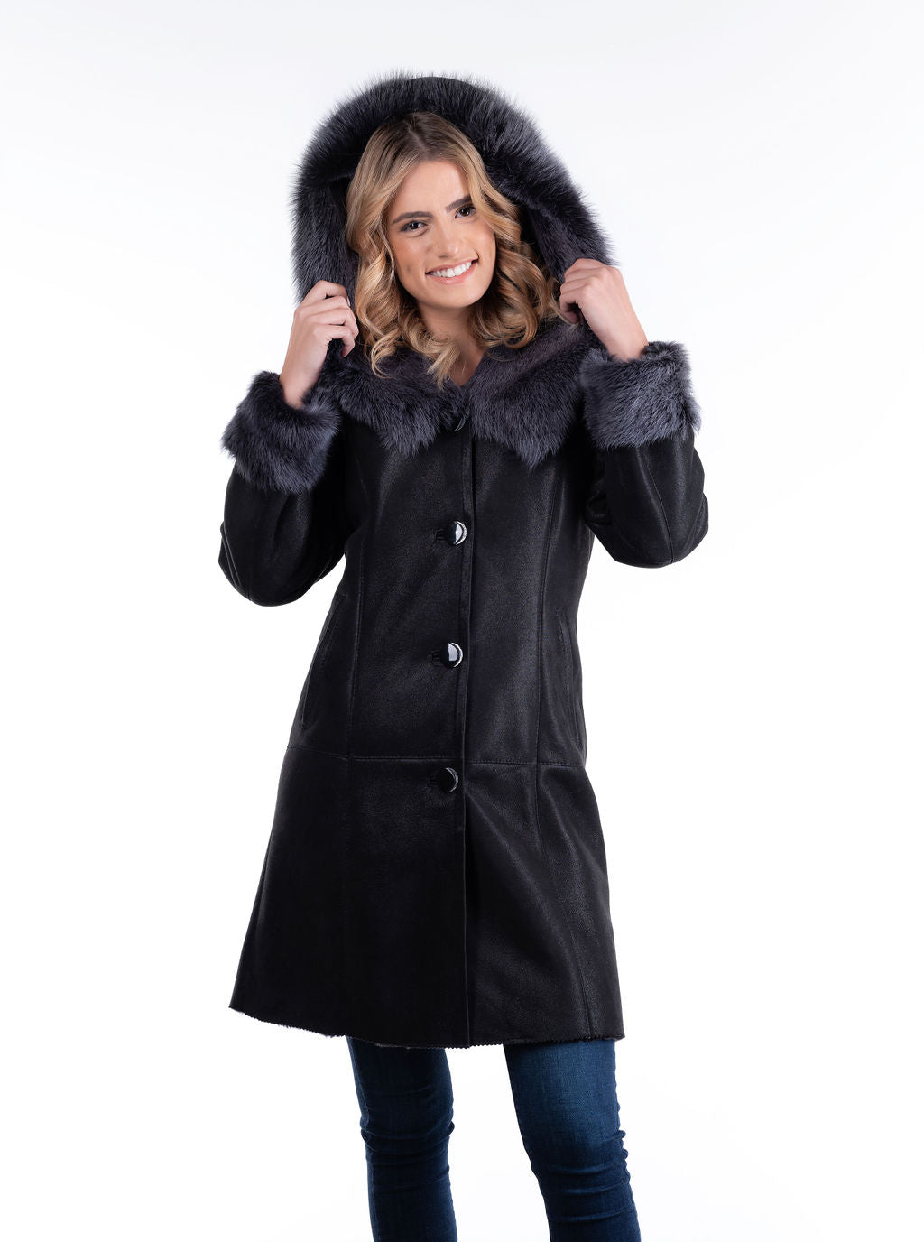 Wiktoria is our above-knee beautiful sheepskin coat. Slightly shorter than our Ewka coat, this masterpiece of handmade shearling from Poland will complement every outfit you wear. Fitted waist and button front closure. Hood can be worn as an attractive collar. Long, unshorn silky sheep wool adorns the hood and cuffs. Sleeve length is adjustable. Only one left in this style and color!
